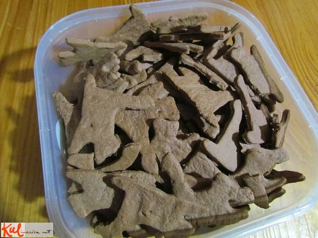 Vse sestavine zmešamo skupaj, pustimo stati 24 ur na hladnem, razvaljamo, izrežemo piškote in jih pečemo na 200 stopinjah 5-10 minut. Po želji piškote pred peko okrasimo z mandlji ali orehi.